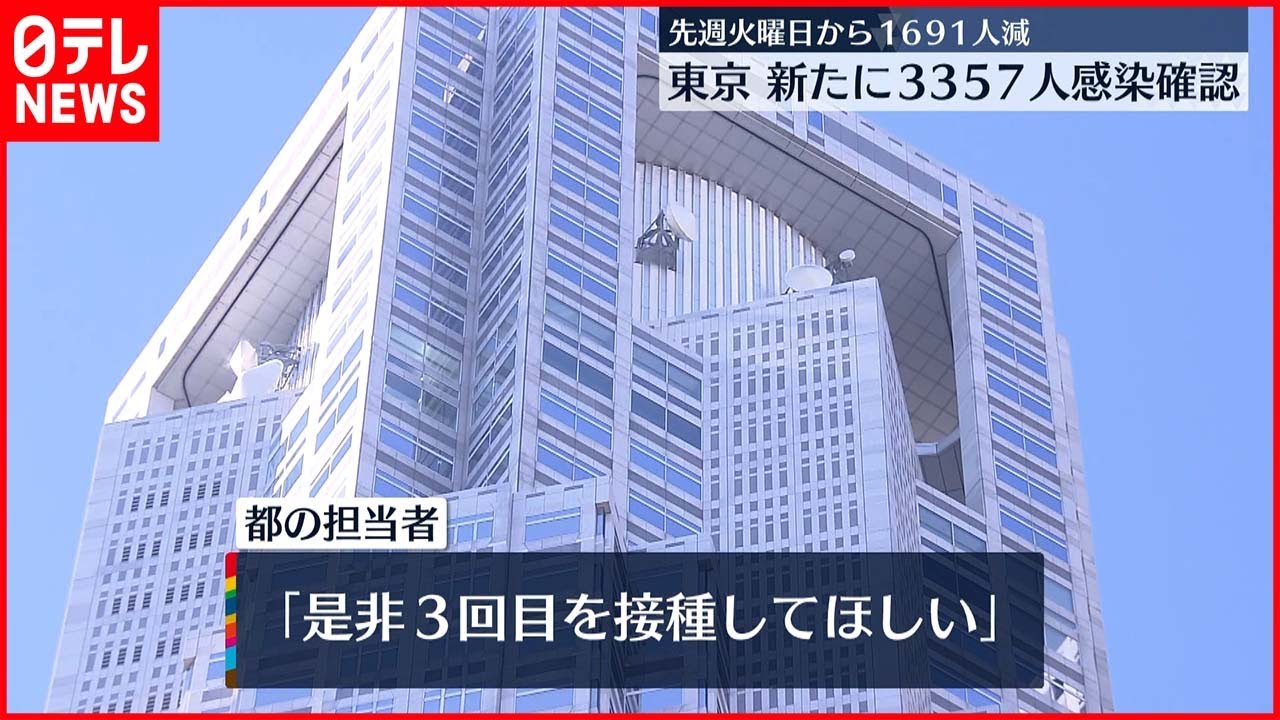 東京都内の新たな感染者は3357人で、先週火曜日から1691人減り、22日連続で前の週の同じ曜日の人数を下回りました。
