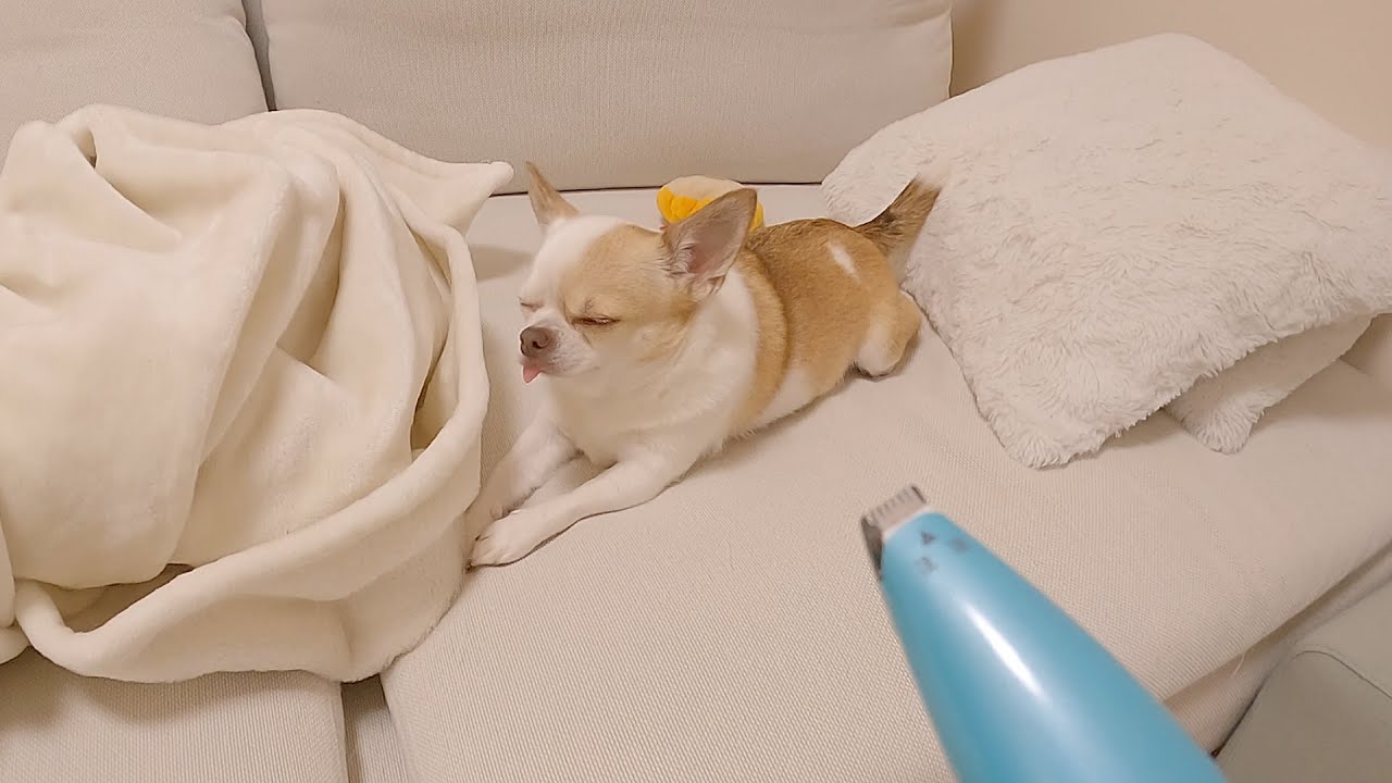 チワワのいの(別名いのチビ、べーちゃん、べろジィ、べー、おチビじぃetc.)のお尻にウンピッピのカスがつくことが増えたのでバリカンで肛門オシャレじぃに大変身でルンルン✨