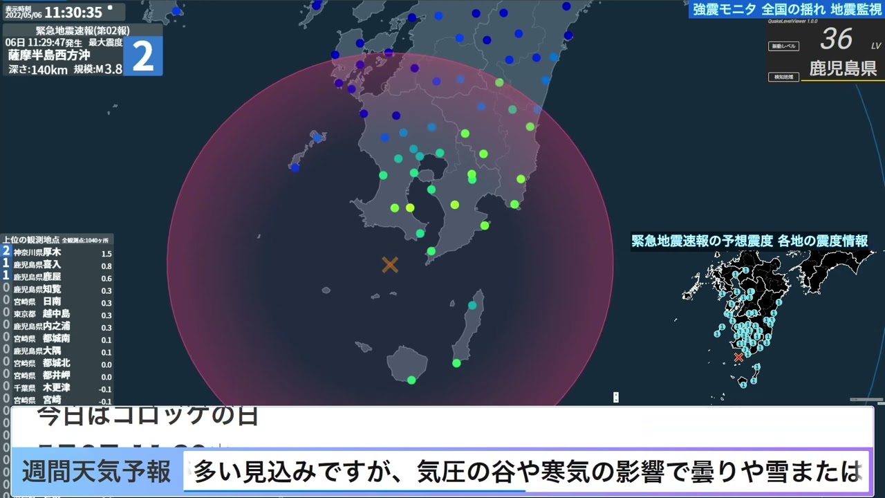 11時29分頃、地震がありました。震源地は薩摩半島西方沖、震源の深さは約130km、地震の規模はM3.9と推定されます。この地震による津波の心配はありません。