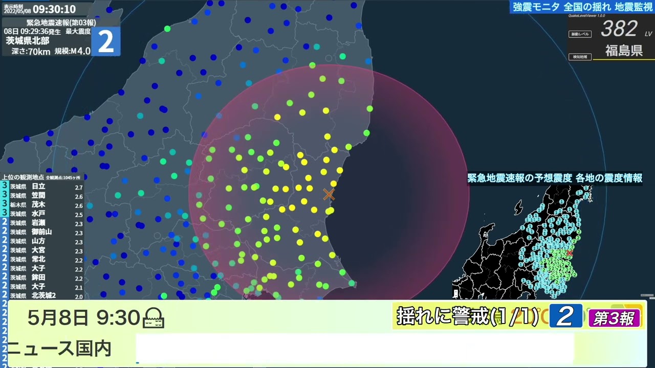 Share Facebook Twitter Pinterest LinkedIn <地震情報> 9時29分頃、地震がありました。震源地は茨城県北部、震源の深さは約60km、地震の規模はM4.0と推定されます。この地震による津波の心配はありません。気象庁は、この地震についての緊急地震速報を発表しています。 この動画はAutoUploaderによって自動生成されたものです。This video was created by AutoUploader. EventId:20220508092945 地震地震情報緊急地震速報
