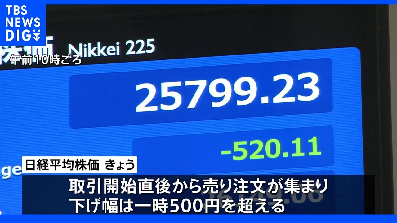 10日の東京株式市場で日経平均株価は取引開始直後から売り注文が集まり、下げ幅は一時500円を超えました。日経平均株価が節目となる2万6000円を割り込むのは今年3月以来およそ2か月ぶりです。