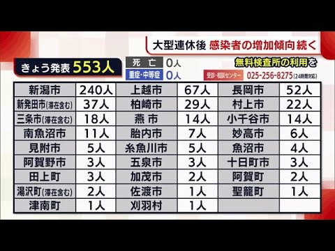 Share Facebook Twitter Pinterest LinkedIn 県内では11日、新たに553人の新型コロナウイルス感染が発表されました。 11日に新たに感染が発表されたのは、新潟市で240人・上越市で67人など、あわせて553人です。 死亡した人や重症・中等症の人はいませんでした。 新潟市では先週土曜日に250人の感染が確認されて以降、一日の新規感染者数は、5日連続で200人台となり、感染者は今後も増える見通しだということです。 県は少しでも不安を感じたら、無料の検査所などを利用するよう呼びかけています。 GWコロナウイルス感染新型コロナウイルス新潟県