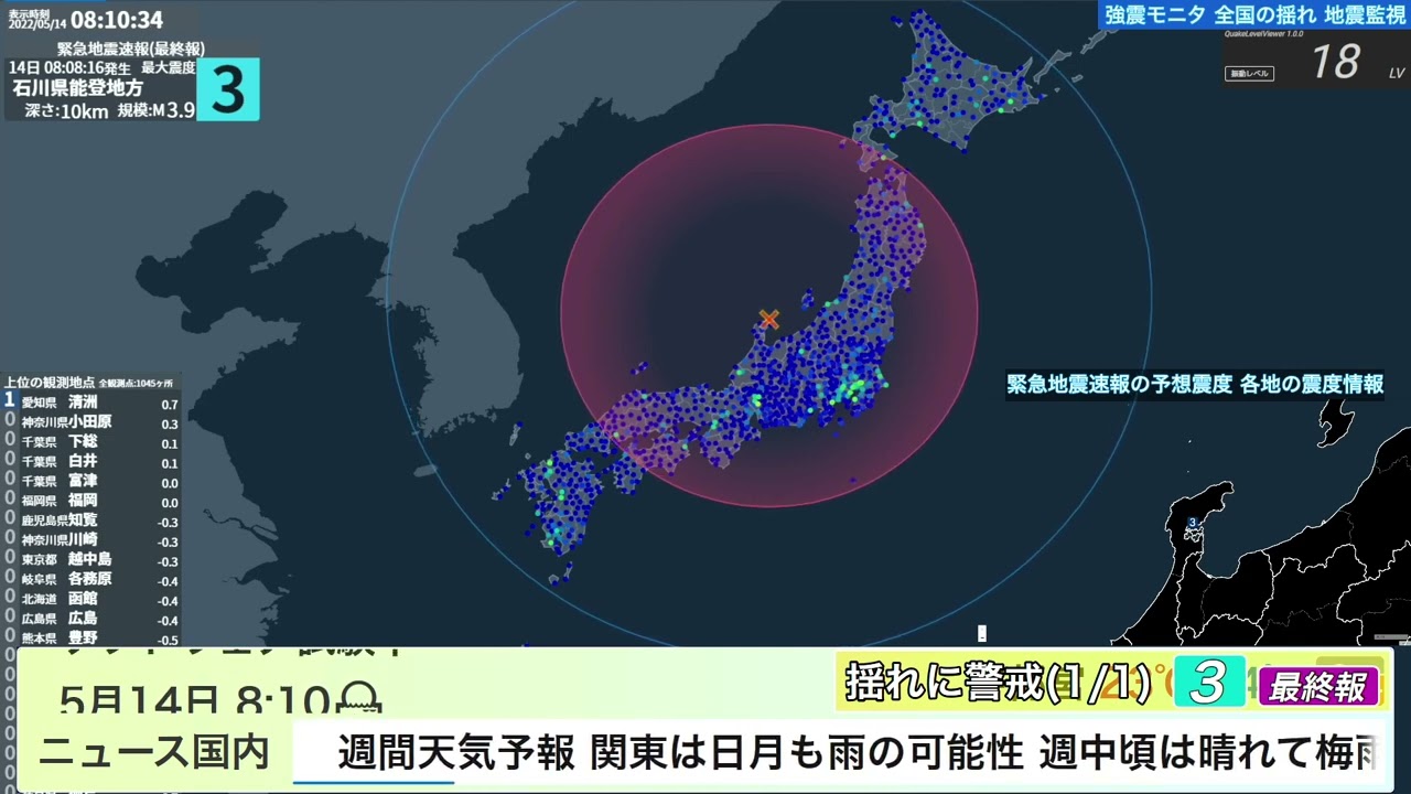 Share Facebook Twitter Pinterest LinkedIn <地震情報> 8時08分頃、地震がありました。震源地は石川県能登地方、震源の深さは約10km、地震の規模はM3.6と推定されます。この地震による津波の心配はありません。気象庁は、この地震についての緊急地震速報を発表しています。 この動画はAutoUploaderによって自動生成されたものです。This video was created by AutoUploader. EventId:20220514080819 地震地震情報緊急地震速報