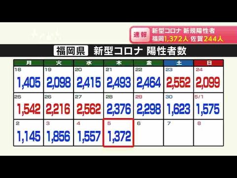 Share Facebook Twitter Pinterest LinkedIn 福岡県は5日、新型コロナウイルスの検査で新たに1372人の陽性を発表しました。 発表自治体ごとの内訳は、福岡市が315人、北九州市が223人、久留米市が103人、そのほかの地域が731人です。県内で亡くなった方はいません。 4日時点で、専用病床の使用率は22.6%で、前の日を0.4ポイント上回りました。重症病床の使用率は3.3パーセントです。 佐賀県の新規陽性者は244人でした。亡くなった方はいません。 新型ウイルス検査で陽性