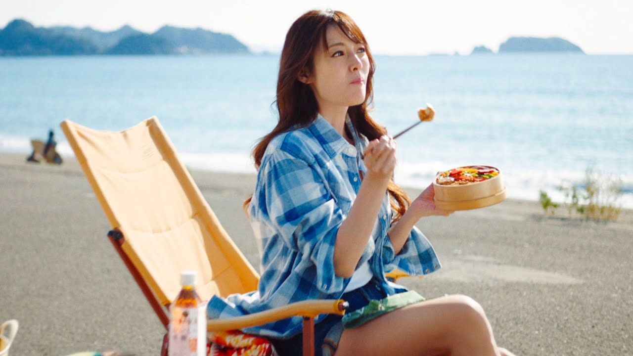 深田恭子、美脚スラリなホットパンツ姿 ビーチでリラックスランチ キリン 午後の紅茶「お弁当に紅茶。新!おいしい無糖」