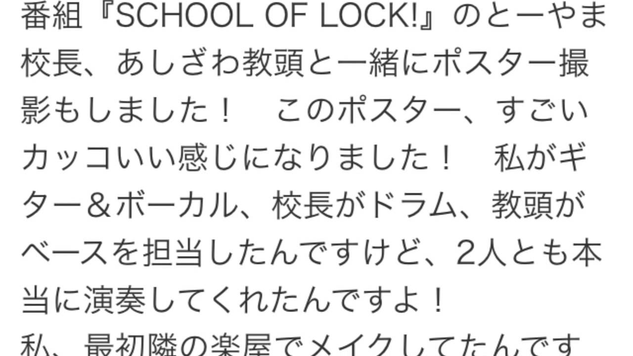 番組『SCHOOL OF LOCK!』のとーやま校長、あしざわ教頭と一緒にポスター撮影もしました! このポスター、すごいカッコいい感じになりました! 私がギター&ボーカル、校長がドラム、教頭がベースを担当したんですけど、2人とも本当に演奏してくれたんですよ!