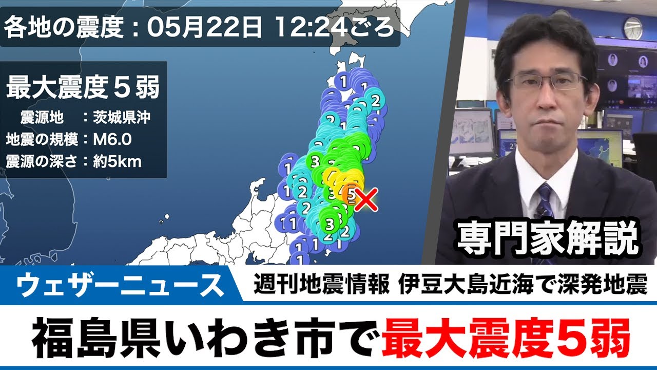 5月22日(日)12時24分頃、福島県で最大震度5弱を観測する地震がありました。また、福島県沖から宮城県沖にかけて発生が多く、能登半島や京都府南部の地震活動も継続しています。震度3以上の地震は2回発生しました。(5月16日~5月22日10時の集計)