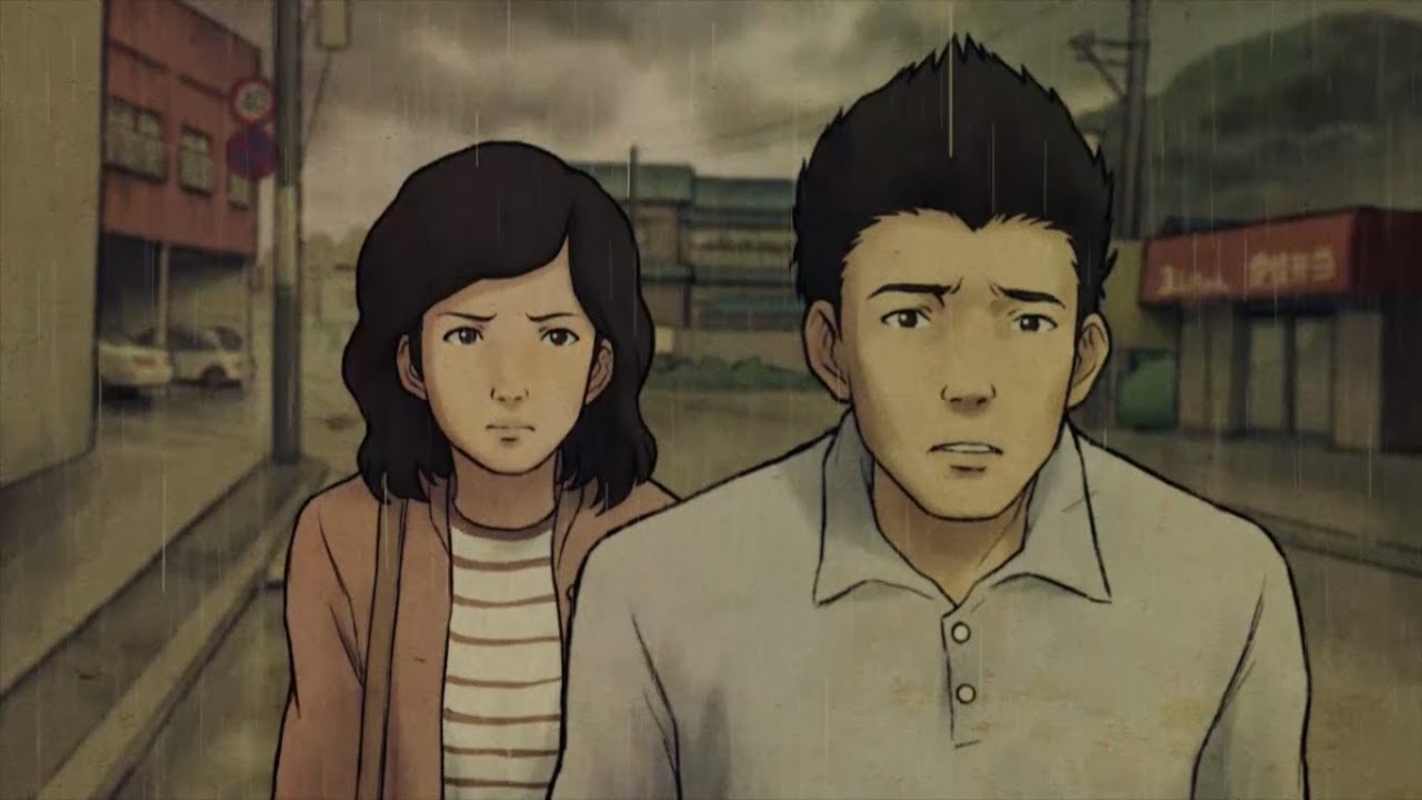 あいにくの天気に妻はヘソを曲げ、夫は必死でそれをなだめる。
