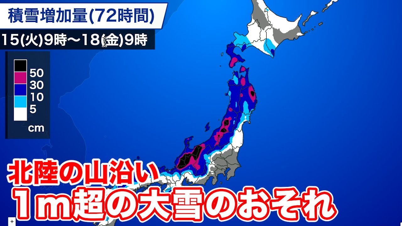 15日(火)は上空の寒気を伴った低気圧が日本海を進み、日本海側の各地で雪や雨の降る所が多くなります。その後は17日(木)をピークに大雪となるおそれがあるため、早めの警戒が必要です。