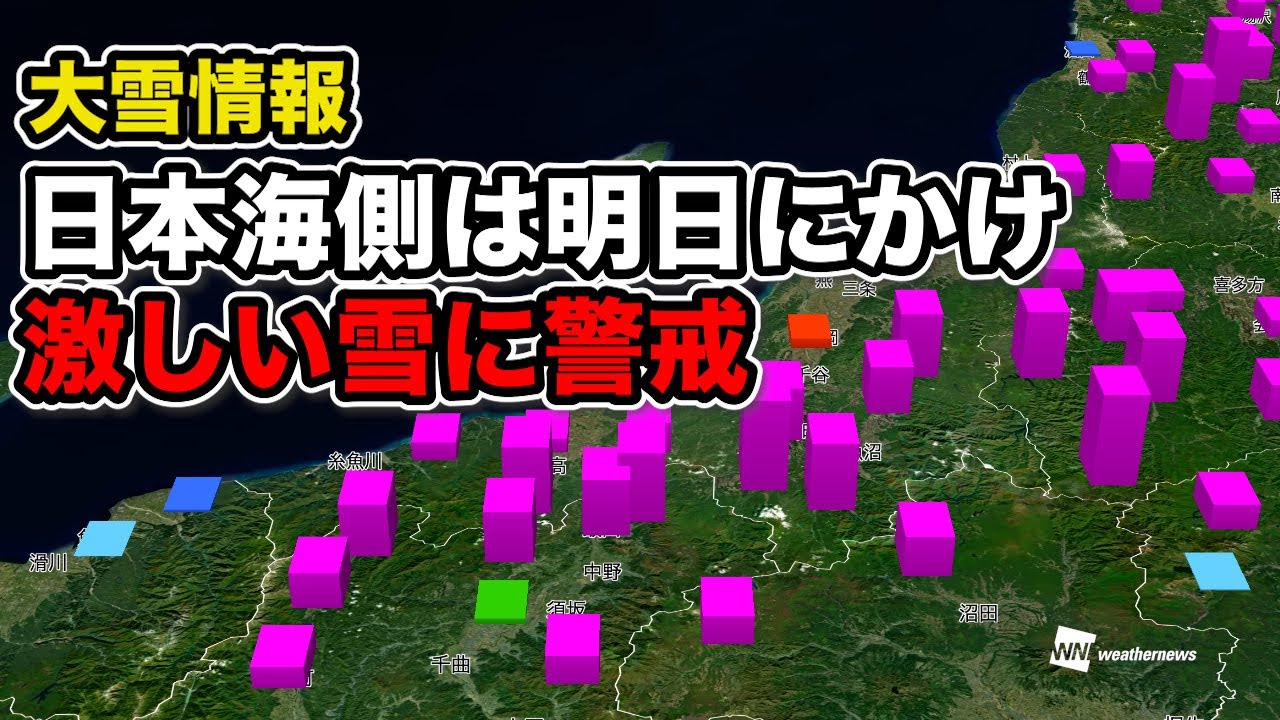 北陸西部の沿岸部はまだ雨のところが多いものの、夜にかけて上空の寒気は南下し雪に変わっていきます。明日5日(水)の昼頃にかけて、日本海側は1時間に5cm以上の激しい雪になるおそれがあり、積雪の増加に警戒が必要です。