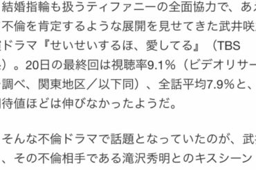 【せいせいするほど、愛してる】ドラマ化!武井咲×滝沢秀明の禁断の恋! TBS系 中村蒼 水沢エレナ トリンドル玲奈 高橋光臣