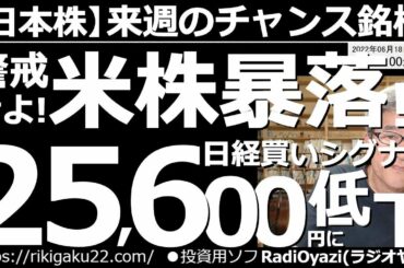 INVESTMENT 2022.06.17 【日本株-来週のチャンス銘柄】アメリカ株暴落を警戒せよ!日経平均買いシグナルは25,600円まで低下! 米株市場が軟調だ。NYダウは昨日30,000ドルを割った。近日中に米株の暴落がありえる。要注意。…