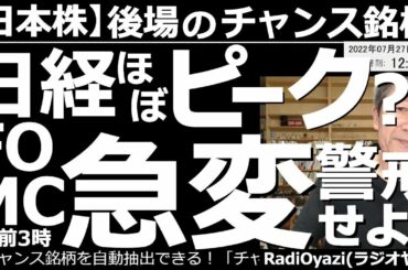 INVESTMENT 2022.07.27 【日本株-後場のチャンス銘柄】日経平均ほぼピーク?米FOMC(午前3時)の急変を警戒せよ! FOMCの結果で株価が大きく上下に変動する恐れがあるので要注意。日経は上昇トレンドに向かう可能性も考慮せよ。…