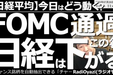 INVESTMENT 2022.07.28 【日経平均-今日はどう動く?】米FOMC通過で(このあと)日経平均は下落する! FOMCは予想通り0.75%の利上げ。一定の安心感から米3指数は上昇した。日経も高く寄ったが、その後売りに押されている。…