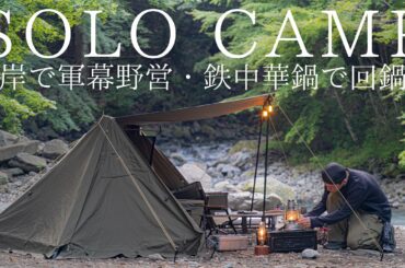 【ソロキャンプ】川のほとりで軍幕野営!新しい無骨なクーラーボックスと鉄中華鍋で回鍋肉を楽しむ!【バンドックソロベースEX】