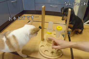 激ムズ知恵玩具に困惑する犬たち