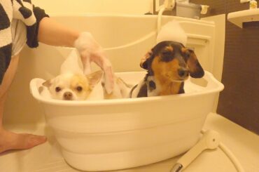 川ではしゃいだ後のお風呂に納得がいっていない犬たち