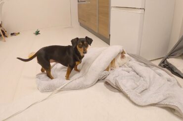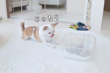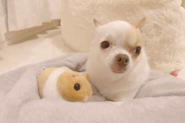 おもちゃに近づくと可愛い唸り声をあげるイカ耳チワワ