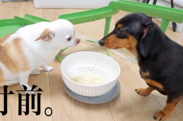 そうめんを前に一触即発のわんこ達。。でもそれ私のです