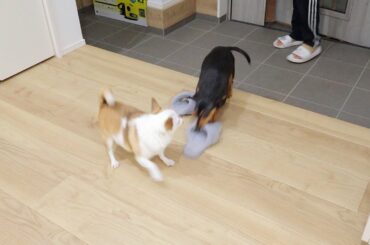 出かけたふりをしてみたら犬にスリッパ強奪されたw