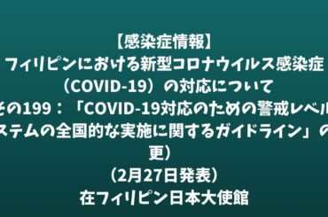 NEWS 2022.03.02 【感染症情報】フィリピンにおける新型コロナウイルス感染症(COVID 19)の対応について(その199:「COVID 19対応のための警戒レベル・システムの全国的な実施に関するガイドライン」の変更)(…