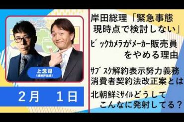 In NEWS 上念司「岸田総理“緊急事態宣言現時点で検討しない”」「ビックカメラがメーカー派遣販売員をやめる理由」「サブスク解約表示努力義務、消費者契約法改正案とは」「北朝鮮はミサイルを発射する理由」2月1日 2022.01.31 …