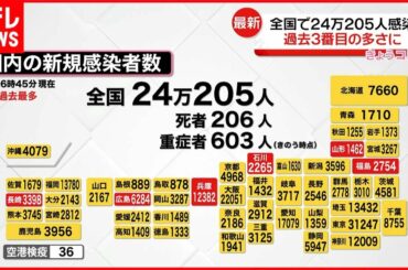 【新型コロナ】全国で24万205人の感染確認 過去3番目の多さ