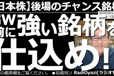 INVESTMENT 2022.04.15 【日本株-後場のチャンス銘柄】GW(ゴールデンウイーク)前に、強い銘柄を仕込め! 日経平均が円安などを追い風に動意づいている。このまま昇り龍と化すかは、わからないが、ここは強い銘柄の買いを検討したい。…