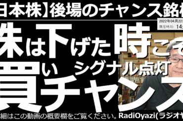 INVESTMENT 2022.04.22 【日本株-後場のチャンス銘柄】株は下げた時こそ買いチャンス?「買いシグナル点灯銘柄」を中心にお伝えする。東証プライムで、株価が安いグループの動向も見る。昨夜の米市場はパウエル発言で下げ、今日は株安だ。…