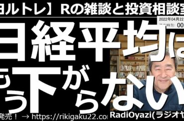INVESTMENT 2022.04.21 【ラジオヤジのヨルトレ】日経平均は、もう下がらない? 今日は長く1357(日経平均と逆連動するETF)を(マイナスの状態で)持っている視聴者さんからのご相談にお答えする。相談銘柄は4413ボードルア。…