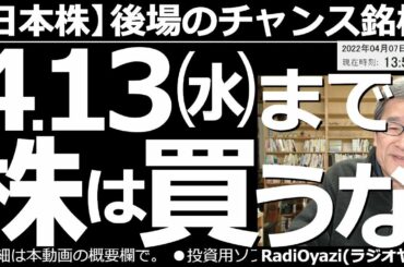 INVESTMENT 2022.04.07 【日本株-後場のチャンス銘柄】4月13日(水)まで、株は買うな! 日経平均は昨日から今日にかけて1,000円ほどの下落となっている。この後、来週の半ば頃まで下げやすい地合と考える。買いは慌てず慎重に。…