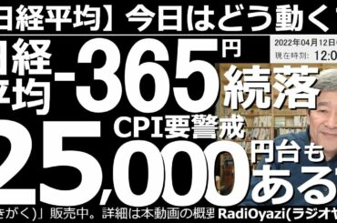 INVESTMENT 2022.04.12 【日経平均-今日はどう動く?】日経平均-366円(前引)で続落。米CPIしだいでは25,000円台もあるか? 米国3指数が、そろって25MAを割り込んでおり軟調だ。今晩のCPI悪化ならさらなる下落も?…