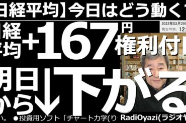 INVESTMENT 2022.03.29 【日経平均-今日はどう動く?】日経平均(前引)+167円の権利付日。明日から下がる! 今日は権利付き最終売買日。明日は現物が配当分だけ下がる。権利落ちから下げ始める可能性が高いが、まだ強含む可能性も。…