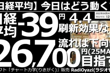 INVESTMENT 2022.04.04 【日経平均-今日はどう動く?】日経平均-39円(前引け)4月4日のリニューアル効果なし。流れは下向き、26,700円を目指す? 今日から東証は、プライム、スタンダード、グロースの3市場。相場の反応は?…
