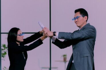 吉田羊、「WOWOWメガネ」新CMに 松重豊と紙の“ライトセーバー”で殺陣披露