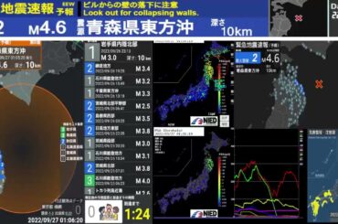 2022年9月27日 緊急地震速報(予報) 最大震度2 震源 青森県東方沖 深さ 10km