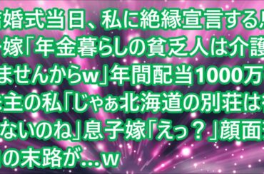 In NEWS 【スカッとする話】結婚式当日、私に絶縁宣言する息子嫁「年金暮らしの貧乏人は介護しませんからw」年間配当1000万の株主の私「じゃぁ北海道の別荘は行かないのね」息子嫁「えっ?」顔面蒼白の末路が…w 2024.05.06 …