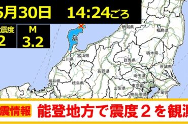 【地震情報(5/30)】石川県能登地方で最大震度2の地震が発生!茨城県沖の地震が立て続いている為、防災意識を高めましょう。