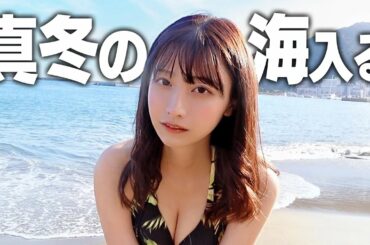 真冬の海に入る女