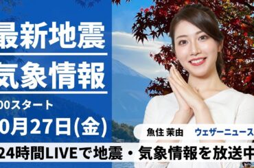 【LIVE】最新気象・地震情報 2023年10月27日(金)/日本海側中心に雷雨注意 太平洋側も天気急変の可能性〈ウェザーニュースLiVEモーニング〉