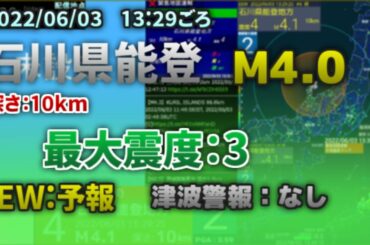 (切り抜きアーカイブ) [地震] 震源:石川県能登地方 M4.0 震度:3 [2022/06/03 13:29 ]