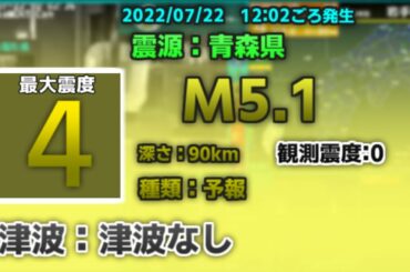 (切り抜きアーカイブ) [地震] 震源:青森県三八上北地方 M5.1 震度:4 [2022/07/22 12:02 ]