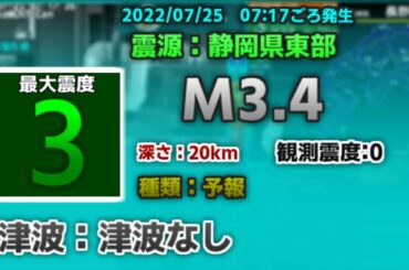 (切り抜きアーカイブ) [地震] 震源:静岡県東部 M3.4 震度:3 [2022/07/25 07:17 ]