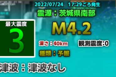 (切り抜きアーカイブ) [地震] 震源:茨城県南部 M4.2 震度:3 [2022/07/24 15:29 ]