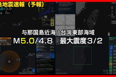 【緊急地震速報(予報)】2023/04/10 03:45 与那国島近海 M5.0 最大震度3 | 2023/04/10 02:45 台灣東部海域 M4.8 最大震度2