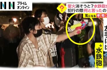 水鉄砲で聖火リレー妨害 「トーチの火を消せ」と叫ぶ女を逮捕