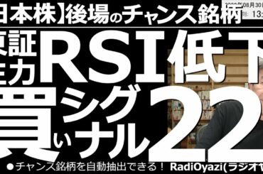 In INVESTMENT 【日本株-後場のチャンス銘柄】東証主力銘柄のRSI低下「買いシグナル」22銘柄! 日経平均が底堅く推移する中、RSIが低下しており、買いのチャンスかもしれない、という銘柄をスクリーニングして紹介する。 2022.08.30 …
